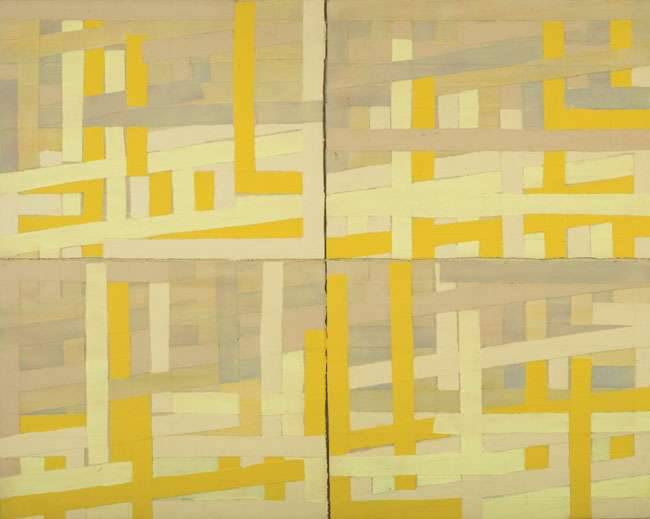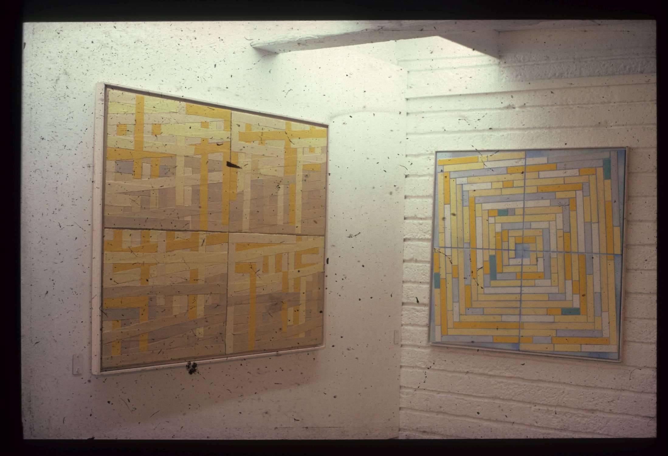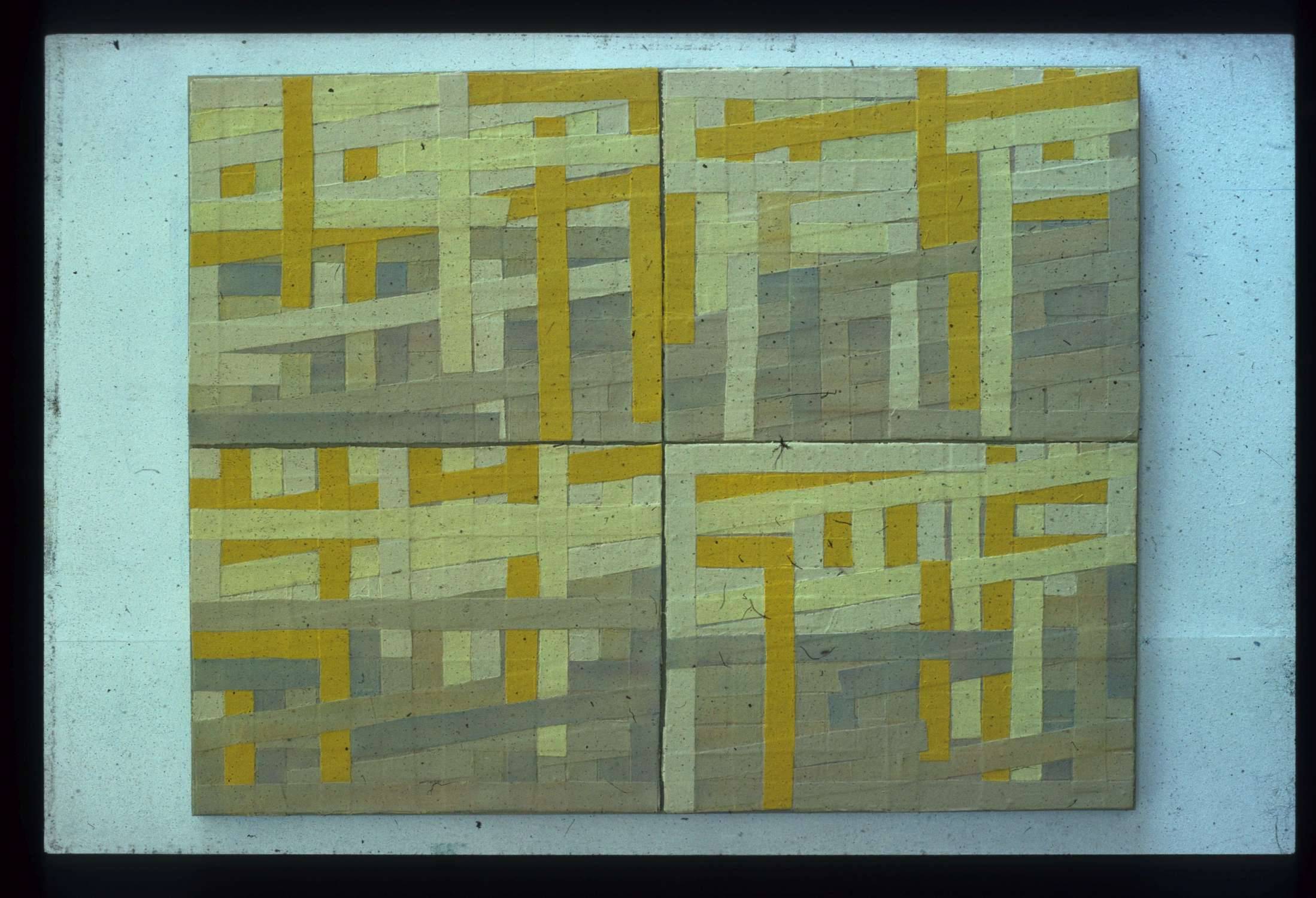 'Straw (1976), Slow (1975) and Snow (1975) are a distinctive group implying movement through the spiralling angles of the rectangular forms invested with irregularly placed colour' (Alan Windsor, Tom Cross: Early Paintings' 2013).