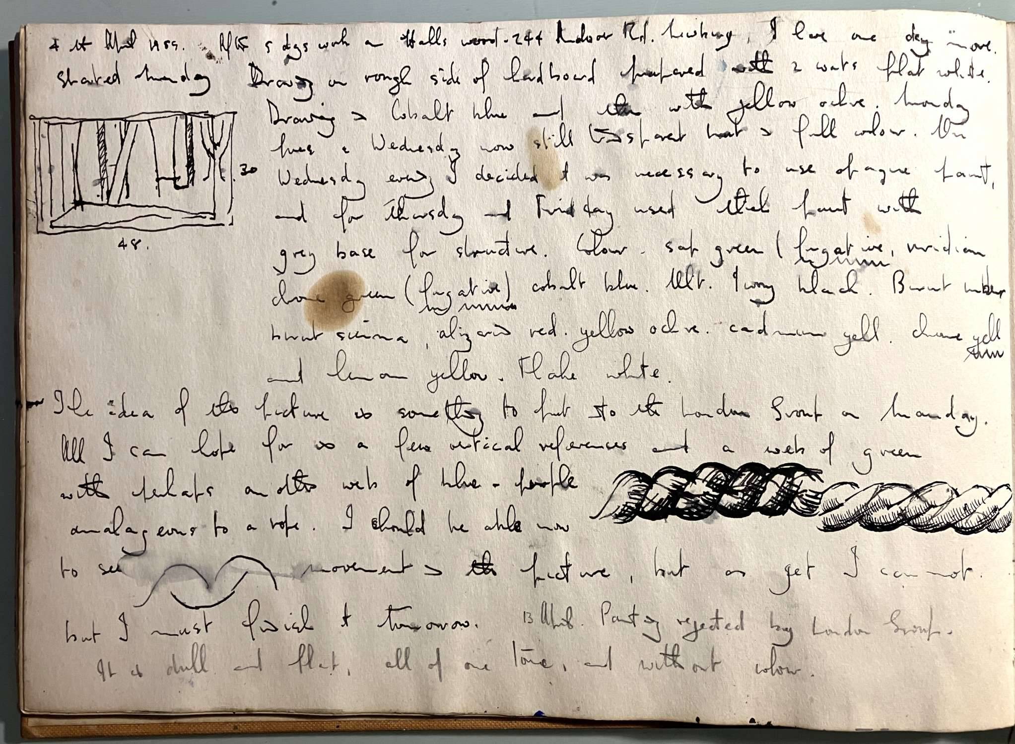 '4th April 1959. After 5 days work on Hall's Wood - 244 Andover Road , Newbury, I have one day more. Started Monday drawing on rough side of hardboard improved with two coats flat white. Drawing in cobalt blue and then with yellow ochre. Monday Tues & Wednesday now still transparent but in full colour. On Wednesday evening I decided it was necessary to use opaque paint and for Thursday and Friday used that paint with grey base for structure. Colour - soft green, veridian clove green cobalt blue. ivory. Black. Burnt amber, burnt sienna...red yellow ochre, cardamon yellow, clove yellow and lemon yellow...white.